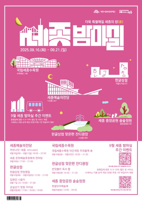 시민과 방문객 모두에게 잊지 못할 초가을의 밤마실 경험을 선사할 이번 행사는, 세종시의 밤을 활기와 감동으로 가득 채운다.
