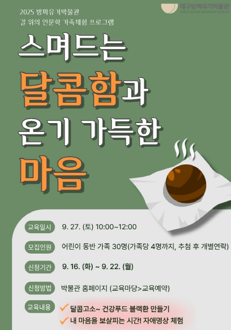대구방짜유기박물관을 비롯한 대구 시립 3개 박물관 관장을 맡고 있는 신형석 대구문화예술진흥원 박물관운영본부장은 “9월 가족 체험 프로그램에 참여해 가을 정취를 느끼며 즐거운 시간을 가지시길 바라며, 아울러 박물관 상설 전시와 특별기획전, 작은전시 등을 관람하며 전통문화와 대구 지역사에 대해 이해하는 시간을 가져보시면 아주 유익할 것이다”고 전했다.