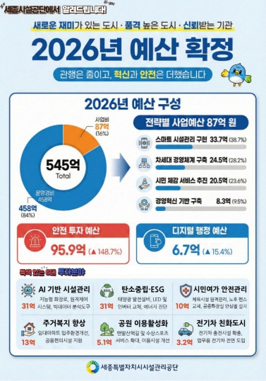 [무한뉴스=정민정 기자] 세종특별자치시시설관리공단은 이사회 의결을 거쳐 2026년도 본예산을 545억원으로 최종 확정했다고 29일 밝혔다.