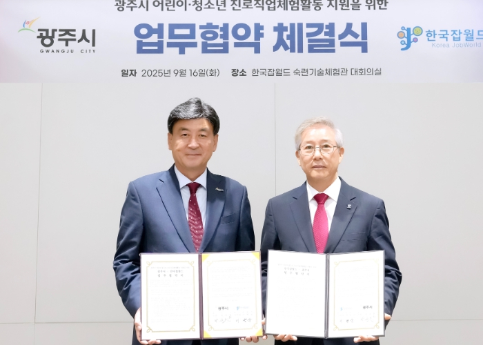 [무한뉴스=정승훈 기자] 광주시는 16일 지역 내 어린이와 청소년들의 진로 직업 체험 활동 지원을 위해 한국잡월드와 업무협약을 체결했다.