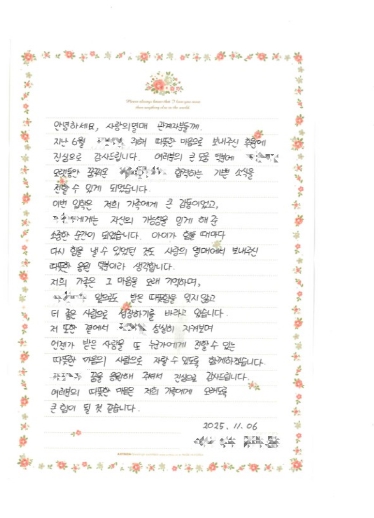 희정씨는 “보내주신 한마디 한마디가 위로가 컸다. 이런 따뜻한 응원이 올 줄 몰랐다”며 “쉽게 드러내지 못했던 마음에 용기가 났고, 더 힘내어 살아가고 싶다”고 다짐했다. 진심으로 감사하다며 환하게 웃었다.