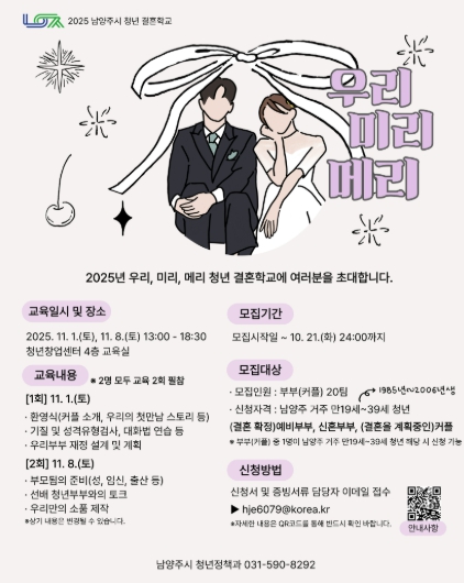 모집 대상은 결혼 확정 예비부부, 최근 6개월 이내 결혼한 신혼부부, 결혼을 계획 중인 청년 20팀이다. 참여자 2인 중 1명이 남양주에 거주하는 만 19세부터 39세의 청년이면 신청이 가능하며, 2명 모두 교육 2회에 참석해야 한다.