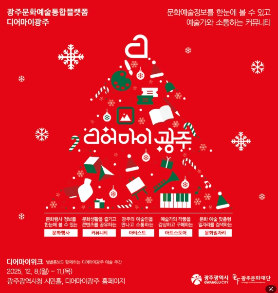 [무한뉴스=정민정 기자] 광주문화예술통합플랫폼 ‘디어마이광주’의 오프라인 축제 ‘디어마이위크’가 12월 8일부터 11일까지 광주광역시청 1층 로비에서 열린다. 올해 축제는 광주광역시 홍보 성과 공유회 ‘2025 별별홍보G’와 연계하여, 문화예술을 기반으로 한 새로운 지역 홍보 모델을 제시하는 데 의미를 두고 있다.