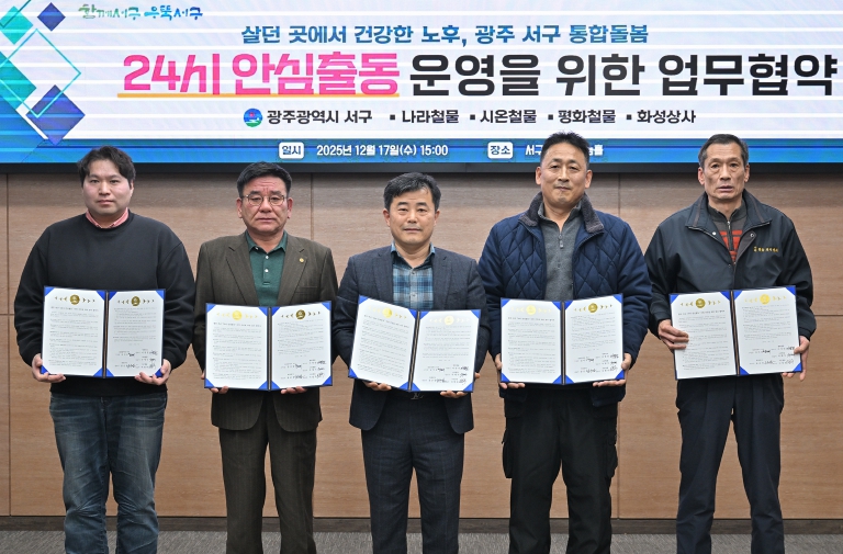 [무한뉴스=정민정 기자] 광주광역시 서구가 주민 일상 속 불편을 신속하게 해소하기 위해 팔을 걷어붙였다. 서구는 17일 서구청 나눔홀에서 관내 착한가게 4곳과 함께 ‘24시 안심출동’ 사업의 안정적 운영을 위한 업무협약을 맺고 빈틈없는 돌봄 서비스 제공에 협력하기로 했다. 이날 협약식에는 김성배 부구청장을 비롯해 윤순섭 화성상사 대표, 이영일 평화철물 대표, 주재식 나라철물 대표, 이영주 시온철물 대표가 참석했다. 이 업체들은 매월 정기 기부로 나눔을 실천하는 ‘착한가게’로 이웃돌봄 역할에도 적극적으로 참여하고 싶다는 뜻을 밝혔다.