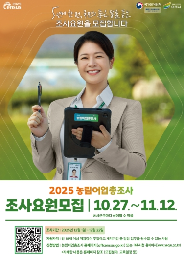 [무한뉴스=정충근 기자] 여주시는 11월 20일부터 12월 22일까지 실시되는 ‘2025 농림어업총조사’을 수행할 조사요원 101명을 모집한다.
