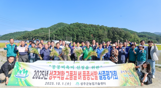 [무한뉴스=최진수 기자] 성주군농업기술센터는 10월 1일 성주군 수륜면 소재 벼 품종비교포에서 성주군 쌀전업농회를 비롯한 농업인과 관계자 등 50여 명이 참석한 가운데 '2025년 고품질 벼 품종선발 실증시험포 평가회'를 개최했다.