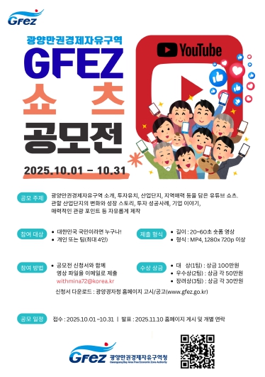 [무한뉴스=정민정 기자] 광양만권경제자유구역청(청장 구충곤)은 10월 1일부터 31일까지 국민 참여형 ‘2025 GFEZ 유튜브 쇼츠 공모전’을 개최한다고 밝혔다.