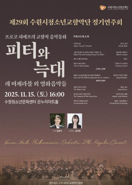 [무한뉴스=양현명 기자] 수원시청소년청년재단 수원청소년문화센터에서는 오는 11월 15일 오후4시, 온누리아트홀에서 제29회 정기연주회를 개최한다. 이번 연주회는 ‘프로코 피에프의 교향적 음악동화 '피터와 늑대'’를 중심으로, 세대를 아우르는 감동의 영화음악을 함께 선보이며 청소년 단원들의 풍성한 음악적 성장을 보여줄 예정이다.