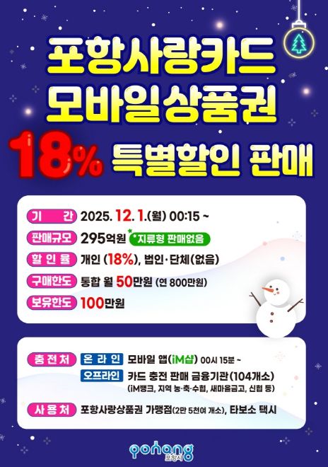 [무한뉴스=최진수 기자] 포항시는 연말 지역 소비 촉진을 위해 내달 1일부터 카드형·모바일 포항사랑상품권(이하 포항사랑카드)을 295억 원 규모로 18% 할인 판매한다.
