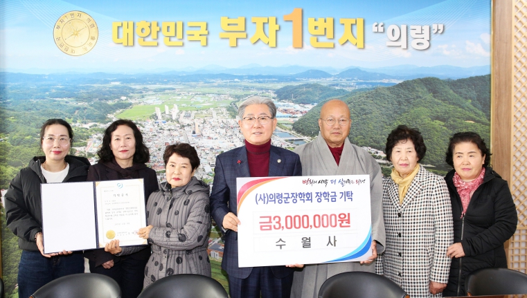 | ▲ 수월사, 지역 인재 육성 의령군장학회 장학금 300만 원 기탁 |