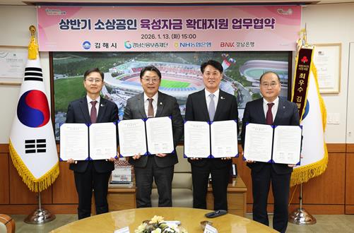 [무한뉴스=최진수 기자] 김해시는 13일 김해시청에서 NH농협은행, BNK경남은행, 경남신용보증재단과 ‘2026년 상반기 소상공인 지원 업무협약(MOU)’을 체결했다.