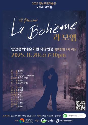 [무한뉴스=최진수 기자] 함안군은 푸치니의 대표작 오페라 〈라 보엠〉을 오는 2025년 11월 28일 오후 7시 30분, 함안문화예술회관 대공연장에서 전석 무료로 선보인다고 밝혔다.