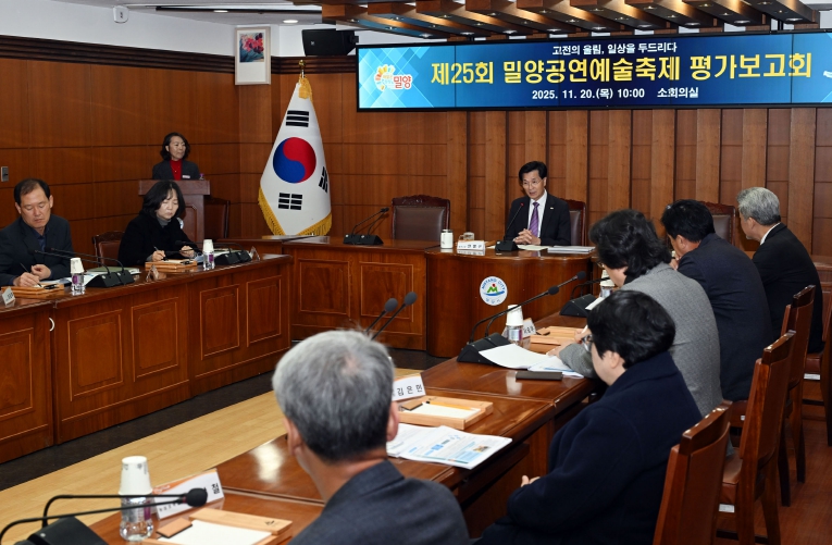경남 밀양시는 20일 시청 소회의실에서 제25회 밀양공연예술축제 평가보고회를 열고, 축제 운영 성과와 개선방안을 논의했다고 밝혔다. 이날 보고회에는 안병구 시장을 비롯한 간부공무원과 축제추진단 위원 등 20여 명이 참석했다.