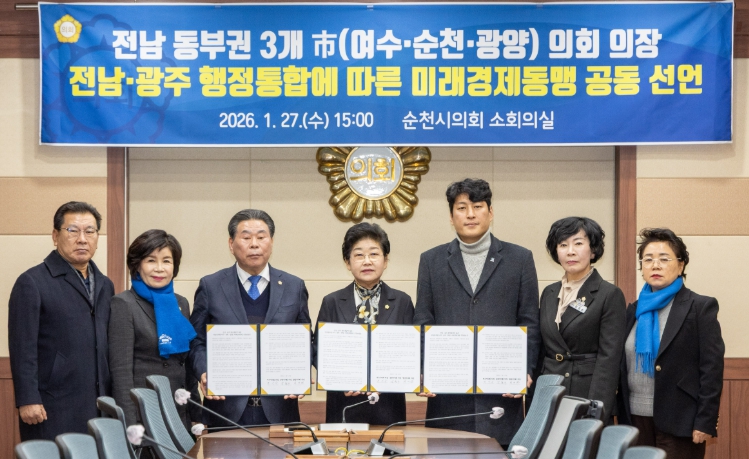 [무한뉴스=정민정 기자] 전라남도와 광주광역시의 행정구역 통합 추진이 급물살을 타고 있는 가운데, 여수시의회, 순천시의회, 광양시의회는 27일 전남·광주 행정통합에 대응하여 전남동부권의 공동발전과 위상 강화를 위한 미래경제동맹 공동선언문을 발표했다.