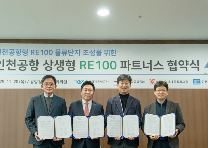 [무한뉴스=정승훈 기자] 인천국제공항공사는 20일 오전 공항청사 회의실에서 물류단지 입주기업 3개社와 함께 ‘상생형 RE100 파트너스 업무협약(MOU)’을 체결했다고 밝혔다.
