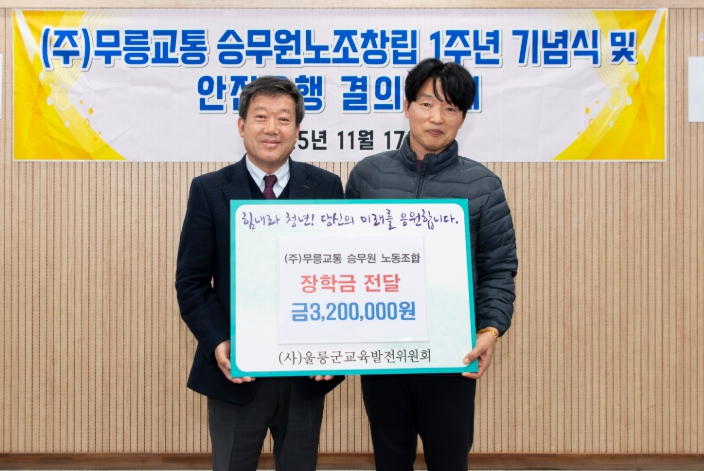 [무한뉴스=최진수 기자] 지난 17일, 주식회사 무릉교통 승무원노동조합은 (사)울릉군교육발전위원회에 지역 학생들의 꿈을 응원하는 마음을 담아 장학금 320만 원을 기탁했다.