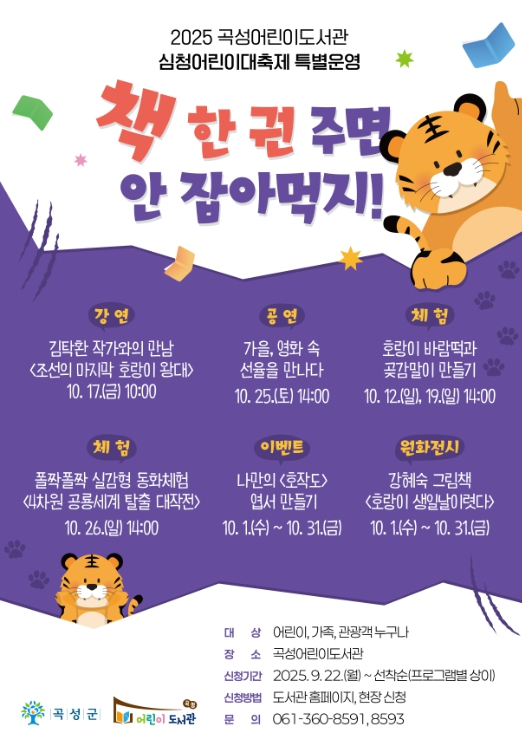 [무한뉴스=정민정 기자] 곡성군은 다가오는 제25회 곡성심청어린이대축제를 기념하여 10월 한 달간 곡성어린이도서관에서 지역민과 방문객을 위한 다양한 볼거리와 독서문화 프로그램을 운영한다고 2일 밝혔다.