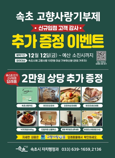 이번 이벤트는 신규 답례품의 인지도 확산과 기부자 만족도를 높여‘다시 기부하고 싶은 속초’ 이미지를 구축하고 지역 활력을 제고하기 위해 마련됐다. 이벤트는 예산 소진 시까지 진행된다.