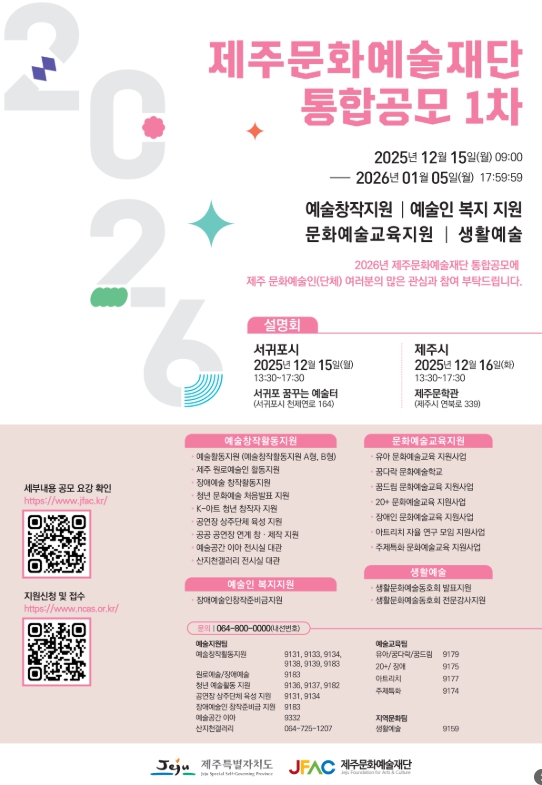 [무한뉴스=정민정 기자] 제주문화예술재단(이사장 김석윤)은 2026년도 지원사업 1차 통합공모를 실시한다. 접수 기간은 2025년 12월 15일부터 2026년 1월 5일까지이며, 문화예술교육 지원사업은 2026년 1월 9일까지 접수한다.