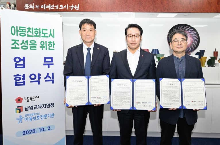 [무한뉴스=정민정 기자] 남원시는 지난 2일 남원교육지원청, 전북동부아동보호전문기관과 함께 아동친화도시 조성 및 아동 권리 증진을 위한 업무협약식을 체결했다.