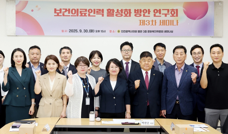 [무한뉴스=양현명 기자] 인천광역시의회 의원연구단체인 ‘보건의료인력 활성화 방안 연구회’는 30일 문화복지위원회 세미나실에서 박판순 대표의원(국·비례)을 비롯해 박창호(국·비례)·이봉락(국·미추홀구3) 의원, ‘의료기사단체 정책연구단’관계자 등이 참석한 가운데 ‘제3차 정책 세미나’를 개최했다.