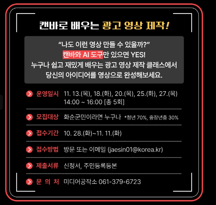 [무한뉴스=정민정 기자] 화순군은 오는 11월13일 오후 2시 화순군 청년센터(청춘들락) 미디어공작소에서 화순군민을 대상으로 AI와 캔바로 배우는 광고영상 제작하기 교육을 진행한다고 밝혔다.