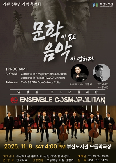부산도서관은 오는 11월 8일 오후 4시 부산도서관 지하 1층 모들락극장에서 개관 5주년 기념음악회 '문학이 묻고 음악이 답하다' 공연을 개최한다고 밝혔다.