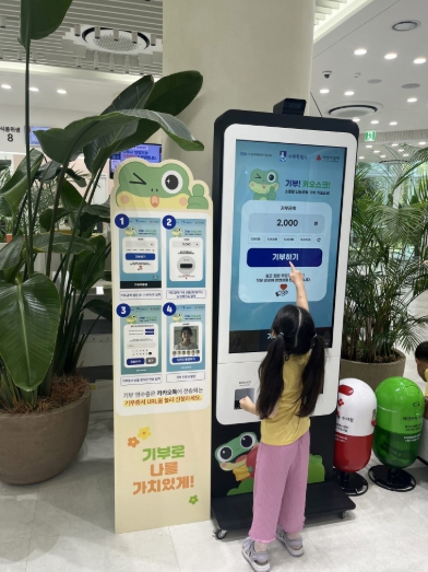 ▲ 한 어린이가 기부 키오스크 활용해 기부를 하고 있다.