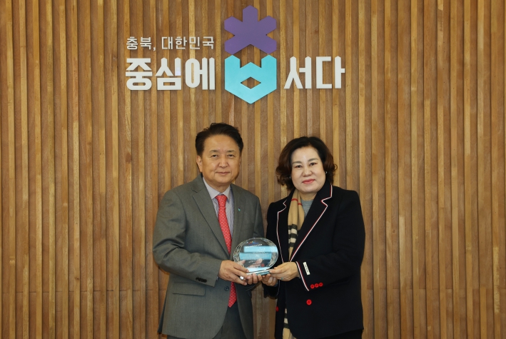 | ▲ 명예사회복지사 위촉패 전달식(왼쪽부터 김영환 지사, 정미경 충북사회복지사협회 부회장) |