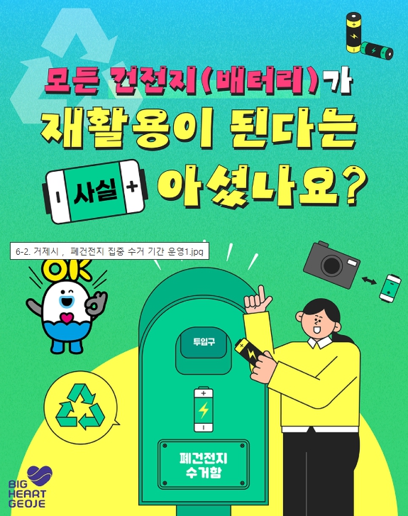 [무한뉴스=최진수 기자] 최근 배터리로 인한 화재와 폭발 사고가 증가하고 있는 가운데, 거제시는 폐건전지를 안전하게 수거하고 폐건전지 수거율을 높이기 위해 오는 11월3일부터 11월 28일까지 한 달 동안 폐건전지 집중 수거 기간을 운영한다고 밝혔다.