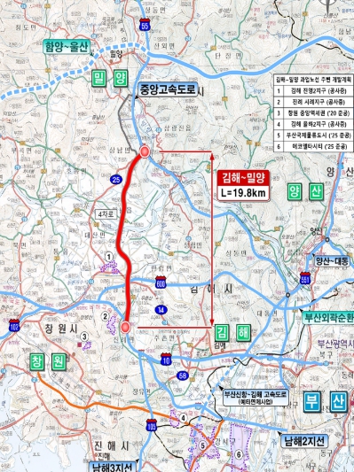 김해~밀양 고속도로 건설사업은 사업비 1조 4,965억 원, 총연장 19.8km 규모로 김해시 진례면과 밀양시 상남면을 연결하는 노선이다. 이 노선은 남해고속도로, 중앙고속도로, 중부내륙고속도로를 연계하는 핵심 구간으로 완공 시 부산·경남 내륙권 간 통행시간이 획기적으로 단축되고 물류 흐름의 효율성이 대폭 향상될 것으로 기대된다.
