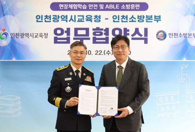 [무한뉴스=정승훈 기자] 인천광역시교육청은 22일 인천소방본부(본부장 임원섭)와 ‘현장체험학습 안전요원 및 ABLE 소방훈련 협력을 위한 업무협약’을 체결했다.