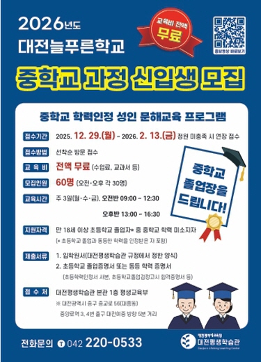 [무한뉴스=정민정 기자] 대전평생학습관은 2026년 2월 13일까지 2026년 대전늘푸른학교 중학교 학력인정 과정 신입생을 모집한다고 밝혔다.