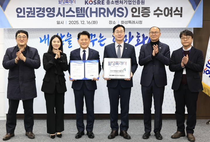 이날 시청 중앙회의실에서 열린 인증서 수여식에는 정명근 화성특례시장과 엄진엽 중소벤처기업인증원 원장 등 주요 관계자들이 참석한 가운데, ‘인권경영시스템(HRMS)’인증서 전달이 진행됐다.