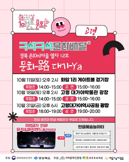 [무한뉴스=최진수 기자] 2025 문화가 있는 날 '구석구석 문화배달' 경북 온(On)마을 열차 12호 고령군 ‘문화路 대가ya’가 10월 문화의 달을 맞아 총 3회의 공연을 선보인다. 이번 행사는 문화체육관광부와 경상북도가 주최하고, 지역문화진흥원·경북문화재단·예술마을사람들이 주관하며, 고령군과 협력해 진행된다.