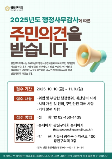 [무한뉴스=양현명 기자] 광진구의회가 오는 11월 17일부터 진행되는 ‘2025년도 행정사무감사’를 앞두고 주민 의견을 10월 10일부터 11월 9일까지 총 31일간 접수한다.