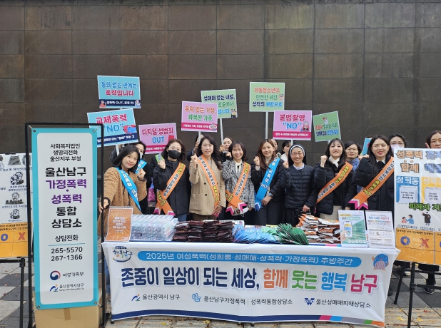 [무한뉴스=최진수 기자] 울산 남구는 ‘2025년 여성폭력 추방주간’을 맞아 27일 삼산 디자인거리 일대에서 울산성매매피해상담소와 울산남구가정폭력·성폭력통합상담소가 함께 ‘2025년 여성폭력 추방주간 캠페인’을 실시했다.