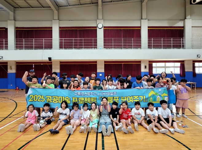 | ▲ 지난 9월 아라예술촌 작가와 구룡포초등학교 전교생이 함께 한 ‘공공미술 프로젝트’ 기념 촬영 |