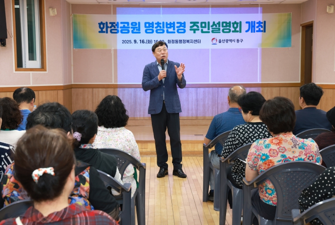 [무한뉴스=최진수 기자] 울산 동구는 9월 16일 오후 4시 30분 화정동행정복지센터 다목적실에서 주민 70명이 참여한 가운데, 화정공원 명칭 변경 사업에 대한 주민설명회를 개최했다.