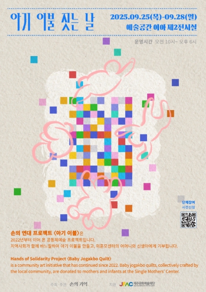 [무한뉴스=정민정 기자] 제주문화예술재단(이사장 김석윤)은 오는 9월 25일부터 28일까지 예술공간 이아에서 '아기 이불 짓는 날' 을 운영하며, 27일까지 참여자 모집을 진행한다.