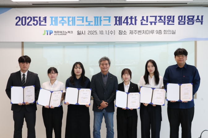 [무한뉴스=정민정 기자] 제주테크노파크(원장 지영흔, 제주TP)가 1일 제주벤처마루 9층 회의실에서 6명의 신규직원에게 임명장을 수여했다.