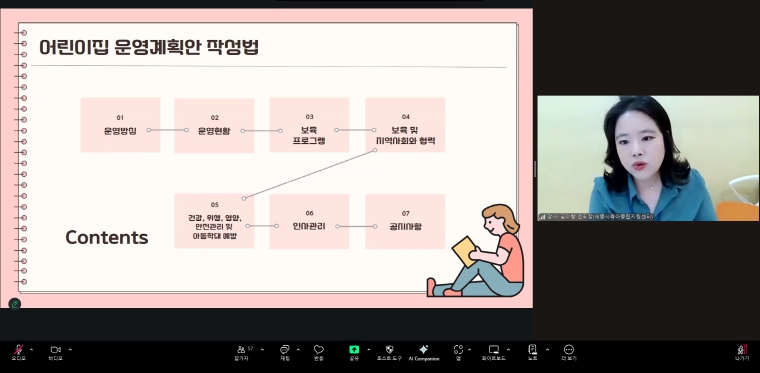 운영계획서는 어린이집의 연간 운영 방향을 설정하고, 교육·보육 목표 및 실행 과제를 구체화하는 중요한 문서로, 그 작성 역량은 현장 운영의 질을 결정짓는 핵심 요소 중 하나이다. 이에 따라 세종특별자치시육아종합지원센터는 보육경력 4년 이상의 보육교직원을 대상으로 경력 교사의 역량 제고 및 차년도 어린이집 운영을 위한 사전 계획 수립을 지원하고자 교육을 제공했다.