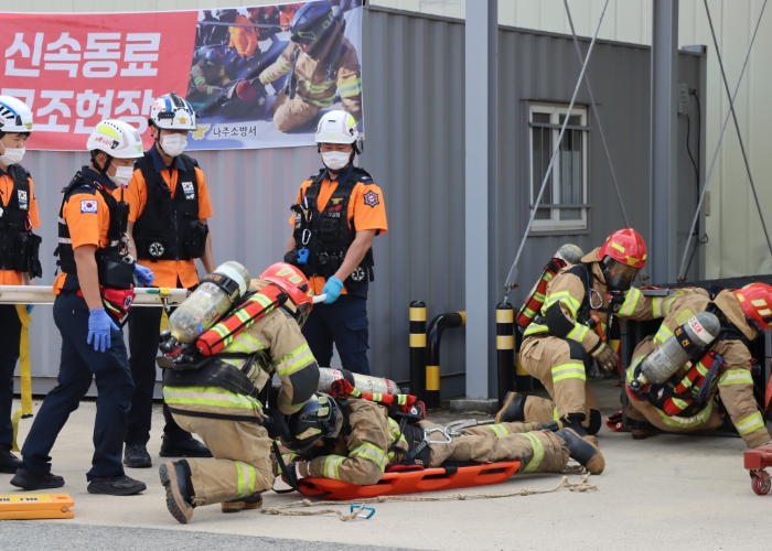 훈련에는 소방과 의용소방대, 유관기관 등 8개 기관, 190여명이 참가하며 30대의 장비가 동원됐다. 3M 나주 2공장 에어컨 실외기 화재로 인한 대형화재로 발생과 함께 유해 물질 누출로 다수 인명피해가 우려되는 상황을 설정해 진행됐다.