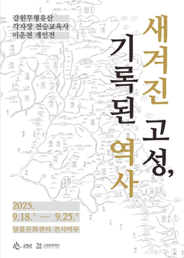 [무한뉴스=정민정 기자] 고성문화재단은 강원특별자치도 무형유산 각자장 전승 교육사 이운천 작가의 개인전 '새겨진 고성, 기록된 역사'를 9월 18일부터 25일까지 8일간 달홀문화센터 1층 전시마루에서 개최한다.