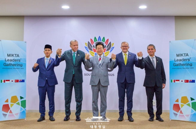 [무한뉴스=최진수 기자] 주요 20개국(G20) 정상회의 참석을 위해 남아프리카공화국을 방문한 이재명 대통령은22일(현지시간) 오후 우리나라, 멕시코, 인도네시아, 튀르키예, 호주 5개국으로 구성된 믹타(MIKTA) 회원국 정상들과 회동했다.