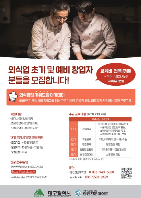 [무한뉴스=최진수 기자] 대구광역시는 외식업 예비창업자와 초기 창업자의 안정적 정착을 지원하기 위해 외식창업 ‘키워드림’ 아카데미 13기 참가자를 10월 15일까지 모집한다.