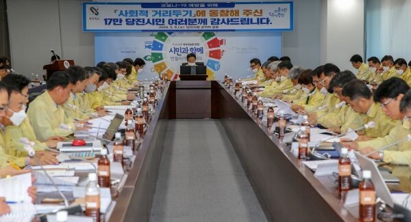 회의에서 당진시 공직자 일동은 3월 22일부터 5월 5일까지 45일동안 사회적 거리두기에 적극 동참해주신 17만 당진시민께 감사의 말씀을 전했다.