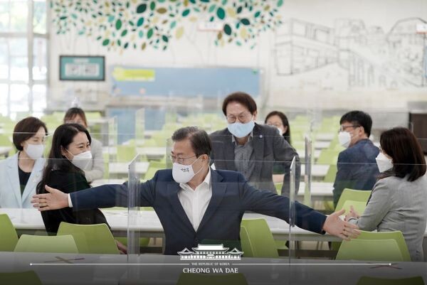 이어 대통령은 등교 시 이뤄지는 손 소독 및 열화상카메라와 비접촉 체온계를 통한 발열 체크를 체험하고, 아크릴 칸막이가 설치된 급식실과 학생들이 가장 많은 시간을 보내는 교실도 둘러보며 책상 간격을 살폈다.
