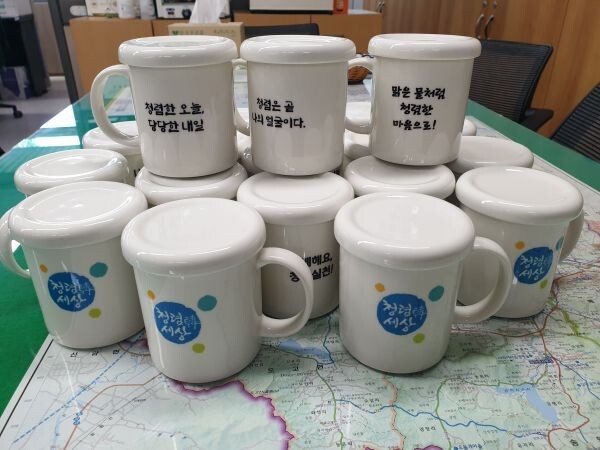 컵 한 면에는 '청렴한 세상' 청렴로고를 담았고 다른 한 면에는 직원 모두가 직접 선정·작성한 청렴다짐문구를 새겨 넣었다.