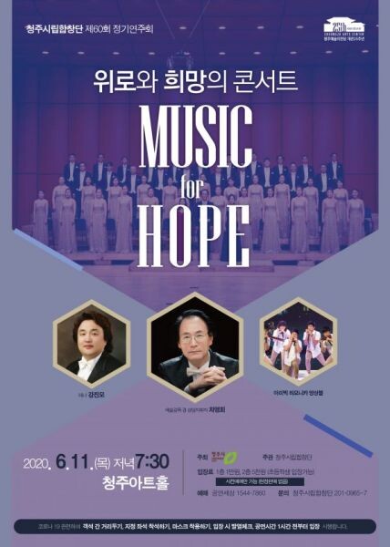 [무한뉴스] 청주시립합창단은 제60회 정기연주회 위로와 희망의 콘서트‘Music For Hope’를 오는 6월 11일 저녁 7시 30분 청주아트홀에서 공연을 펼친다.